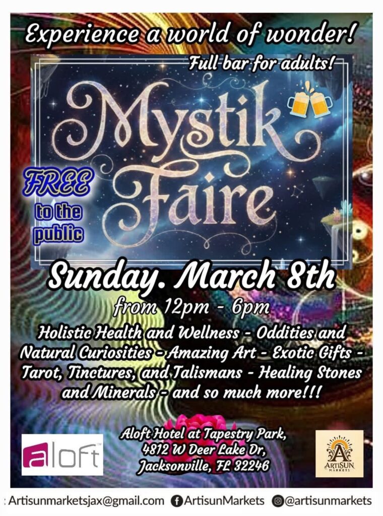 The Mystik Faire will be inside the Aloft Hotel at Tapestry Park on Sunday March 8th from 12-6 pm! FREE ADMISION This event will feature unique treasures including oddities & natural curiosities, amazing artwork, holistic health & wellness products, metaphysical goods, tarot, one-of-a-kind jewelry & accessories. Indulge in expertly crafted adult drinks and mixtures from the full bar. With captivating music and visuals, this event is poised to be an unforgettable celebration of creativity and self-expression! Delicious food will be available in the courtyard as well Sultania & Alexander Nemo are going to a new event in Jacksonville, Florida.  We will be at the Mystik Faire being held at  the Aloft Hotle at Tapestry Park. 4812 W. Deer Lake Dr. Jacksonville, Fl. 32246